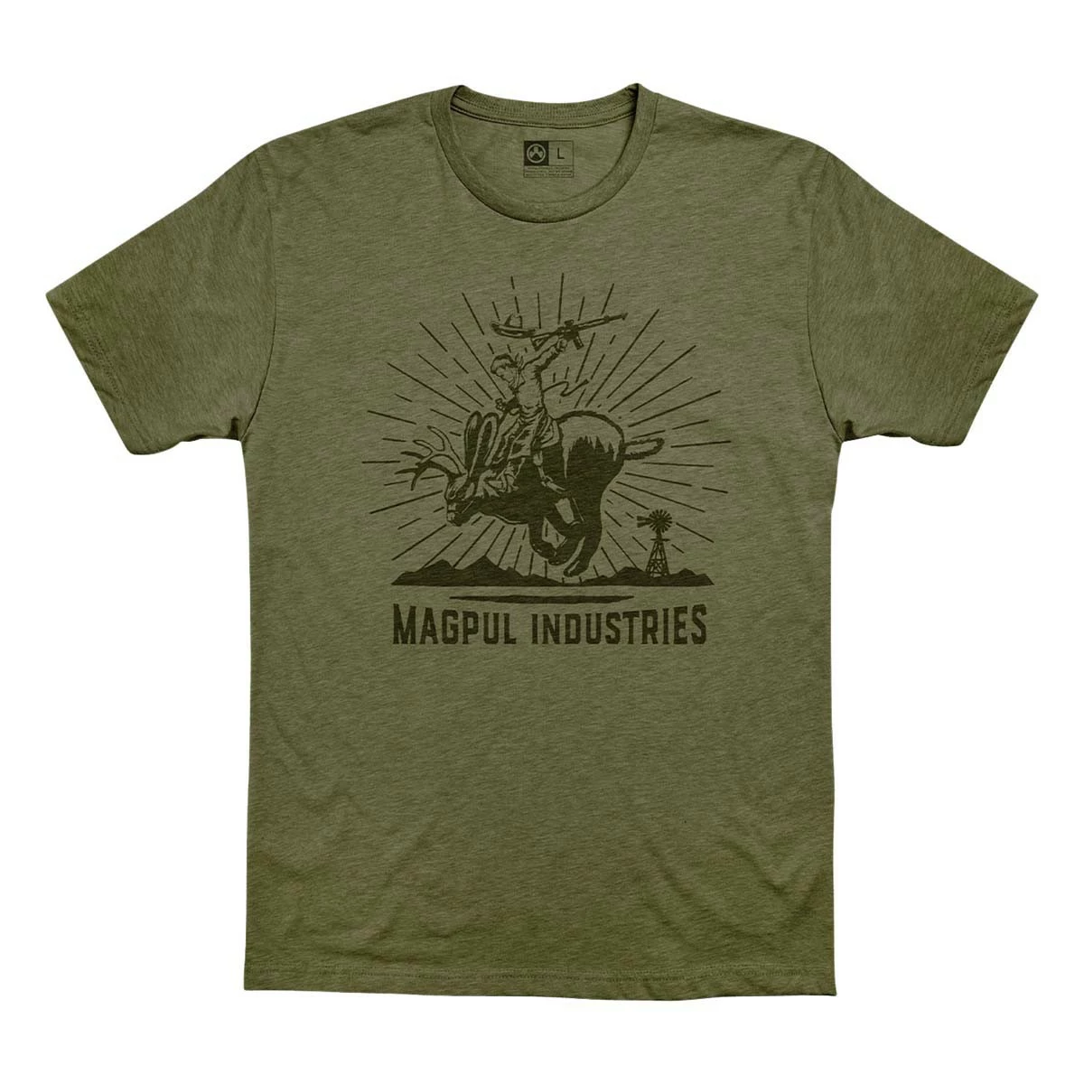 Magpul Jackalope Rodeo CVC T-shirt is made of combed ring-spun cotton and polyester. It features a crew neck with set-in sleeves, tag-less interior neck label, and double-needle stitching on hems and sleeves for durability.